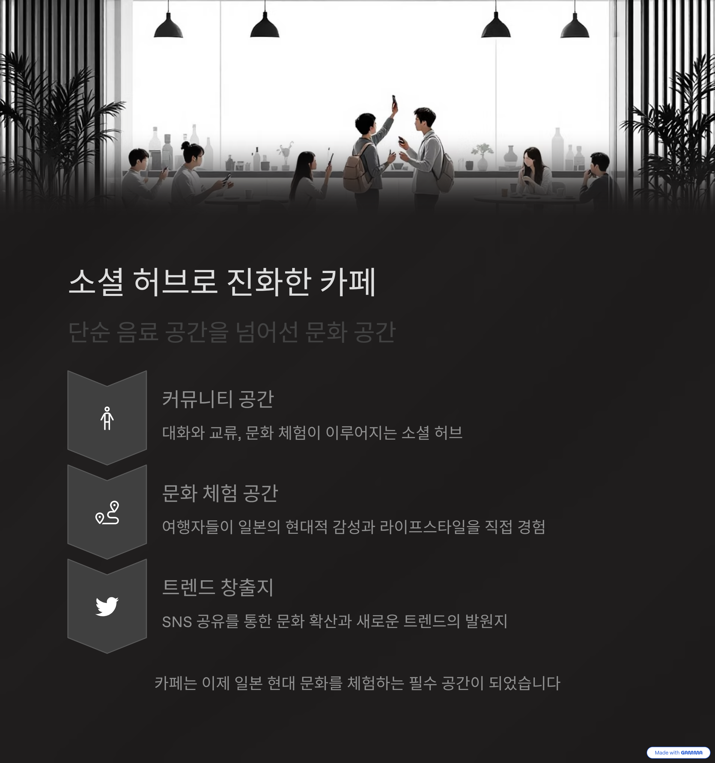 단순히 커피를 마시는 것이 아니라 사람들과의 교류와 문화 체험을 즐기는 것이 중요합니다. 일본 대도시의 카페는 소셜 공간으로, 대화와 만남, SNS 공유를 통해 여행자에게 특별한 경험을 제공합니다.