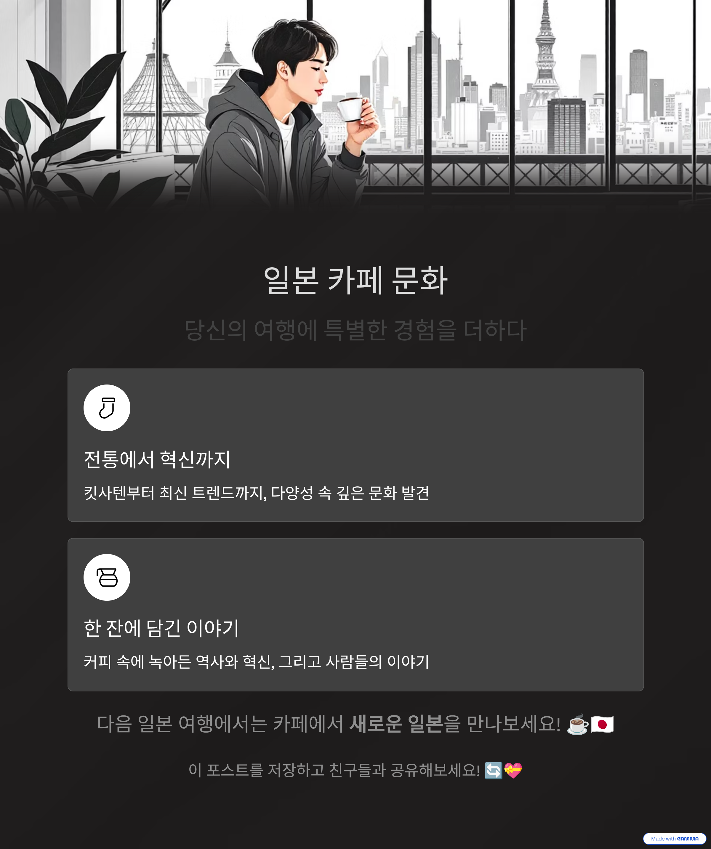 일본 대도시에서 기억에 남는 카페를 방문한 적이 있으신가요? 특별히 인상 깊었던 카페 경험이나 추천하고 싶은 곳이 있다면 댓글로 공유해주세요. 여러분의 이야기가 다른 여행자들에게 좋은 영감이 될 수 있습니다.