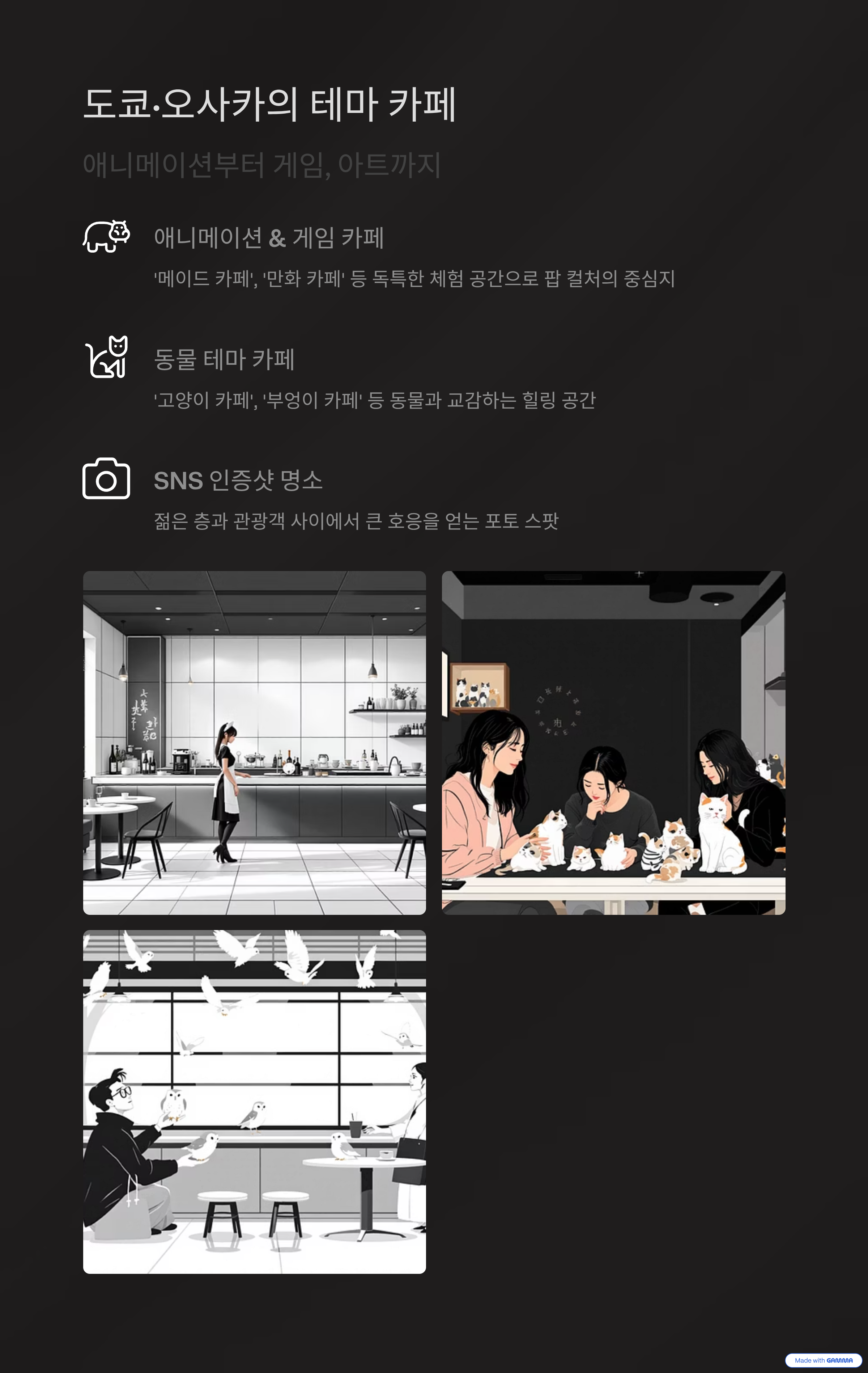 | 애니메이션, 게임, 아트 테마 | 단순한 인테리어와 고급 커피 | 대화와 SNS 공유 중심 |
