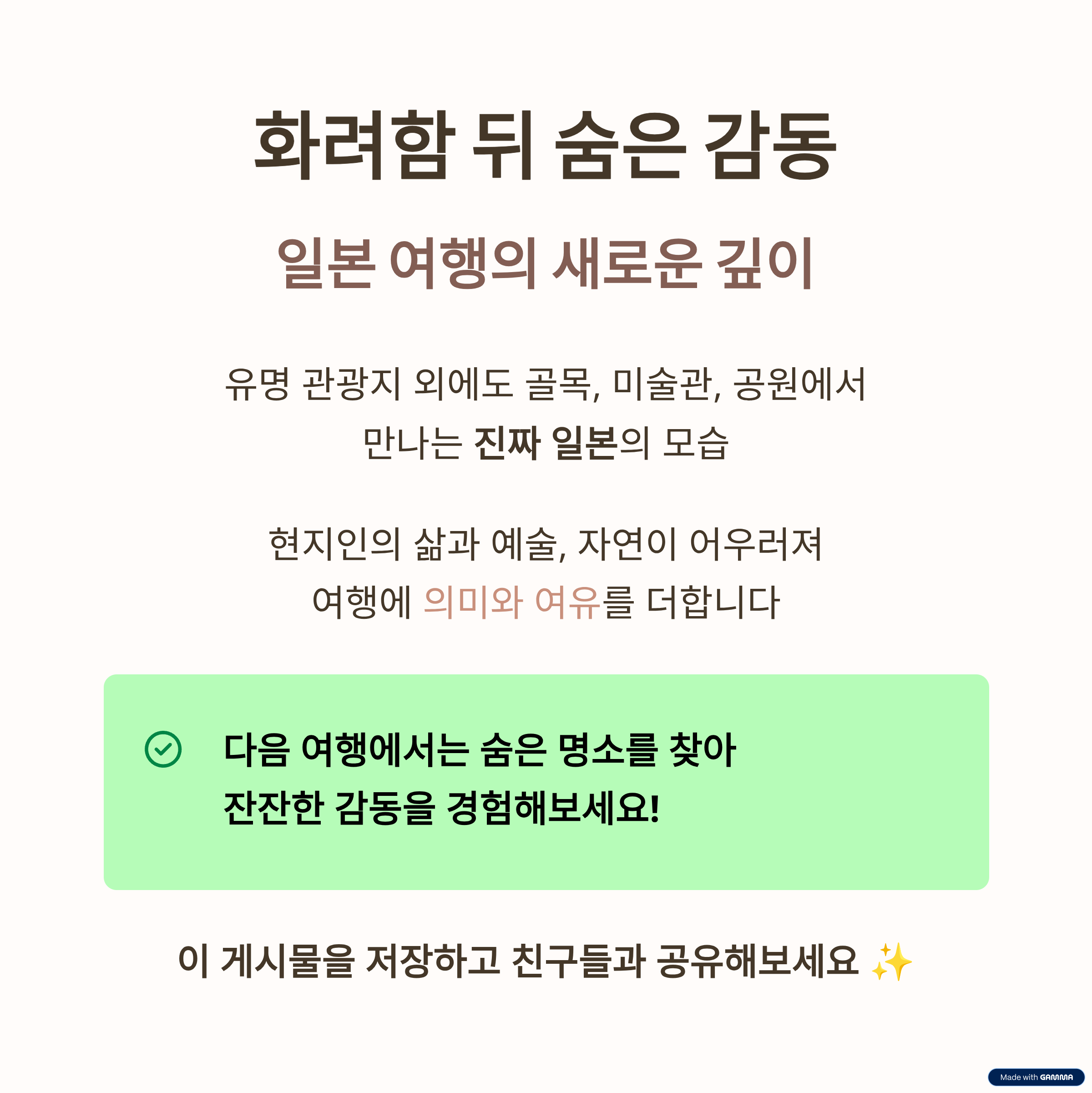 일본 여행에서 여러분만의 숨은 명소를 발견한 적이 있나요? 혹은 꼭 추천하고 싶은 특별한 장소가 있다면 댓글로 공유해주세요. 여러분의 경험은 다른 여행자들에게 새로운 영감을 줄 수 있습니다.