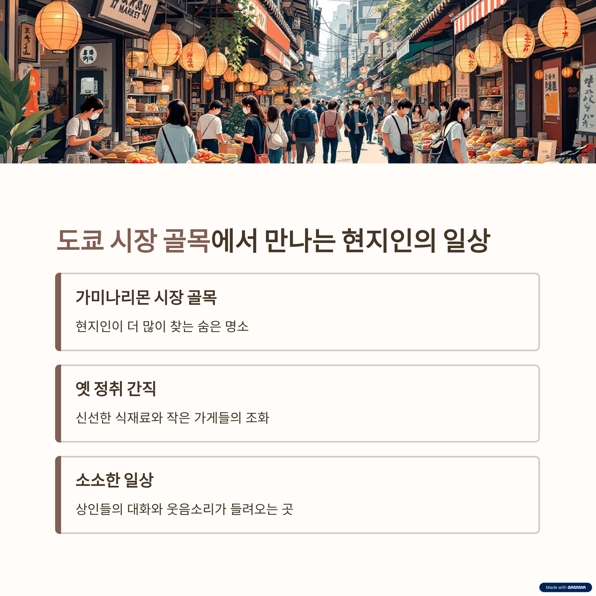 일본의 대도시 여행에서 자주 놓치기 쉬운 명소 중 하나는 바로 전통이 살아 있는 골목길입니다. 도쿄의 시타마치 지역이나 오사카의 작은 시장 골목은 화려한 번화가와 달리, 세대를 거쳐 이어져 내려온 상점과 음식점들이 자리하고 있습니다. 이런 장소에서는 현지인의 일상적인 풍경을 마주할 수 있으며, 관광객들에게는 특별한 감성과 추억을 선사합니다. 특히 현지식 음식을 맛보거나 장인들의 손길이 느껴지는 공예품을 접할 수 있어, 여행의 깊이를 더해줍니다.