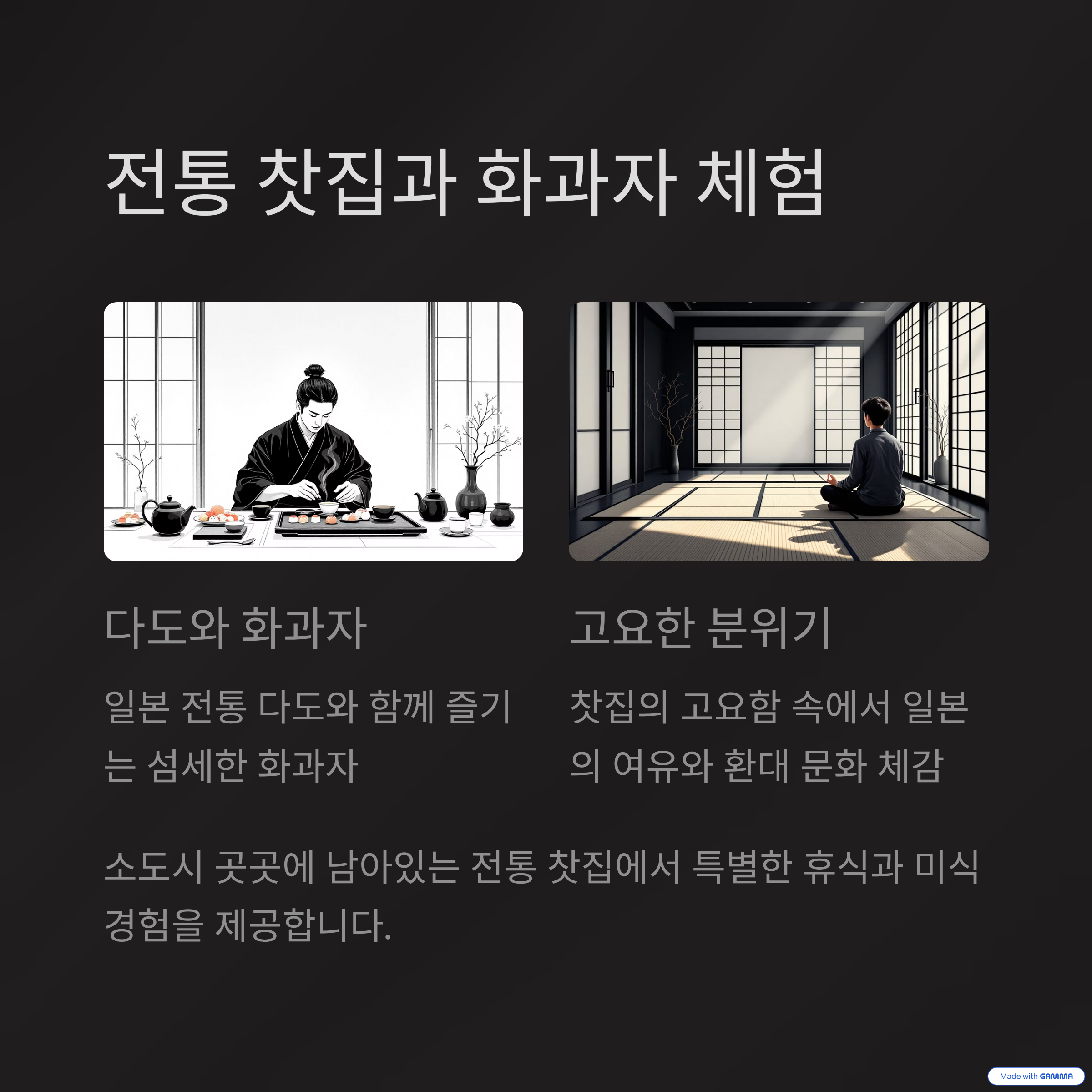 전통 찻집은 소도시 음식 문화의 또 다른 매력입니다. 다다미 방에서 차와 함께 제공되는 화과자나 지역 특산 디저트는 일본의 섬세한 미식을 보여줍니다. 여행자는 이곳에서 여유로운 시간을 보내며 현지의 환대와 문화를 온전히 느낄 수 있습니다. 일본 소도시의 음식 문화는 맛과 함께 따뜻한 인간적인 교류까지 담아내는 특별한 경험입니다.