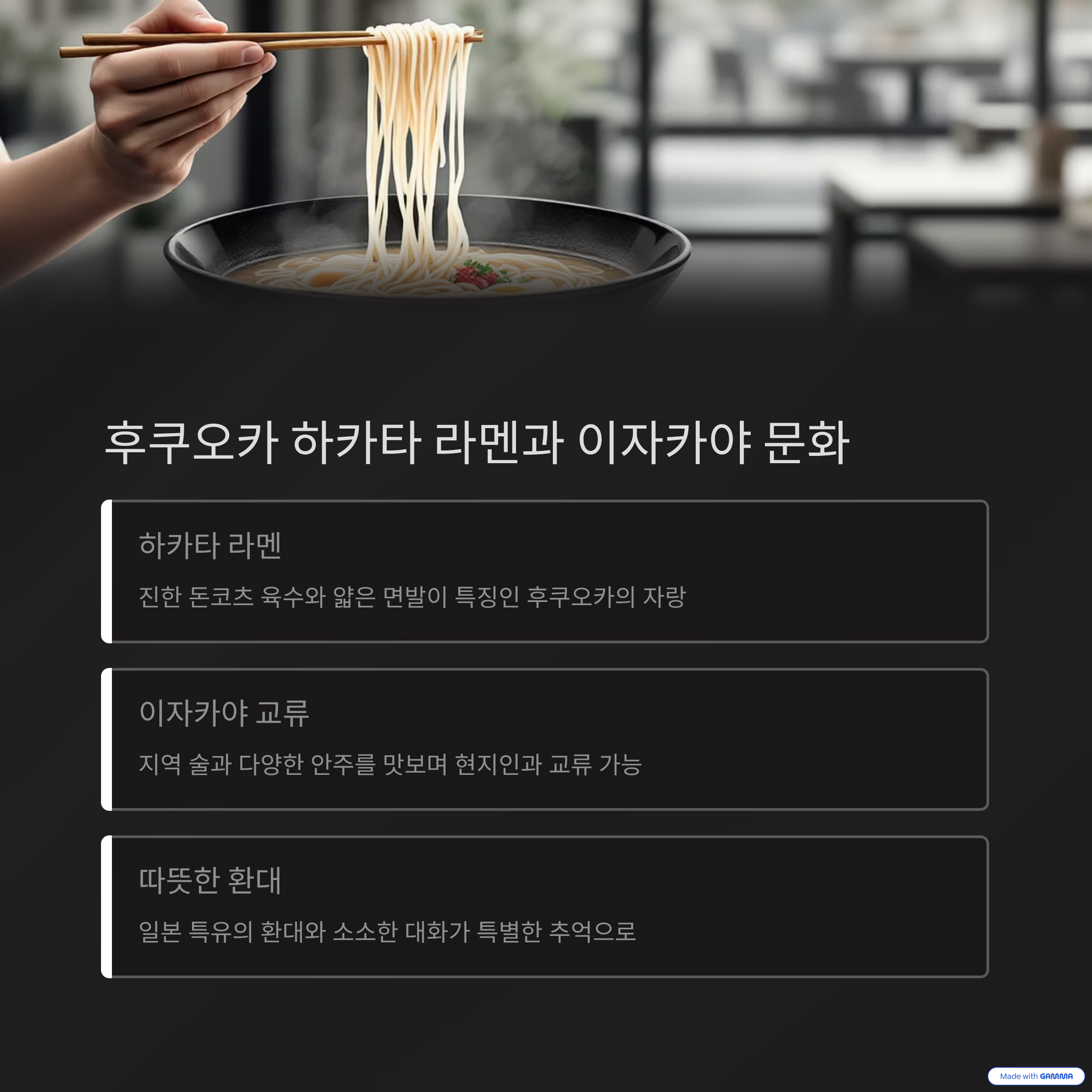 일본 소도시 음식 문화의 가장 큰 매력은 각 지역이 가진 독특한 향토 요리를 경험할 수 있다는 점입니다. 예를 들어 나고야의 미소카츠는 진한 된장 소스가 더해져 깊은 풍미를 자랑하며, 히로시마의 오코노미야키는 층층이 쌓아 올린 재료와 소스로 독특한 맛을 선사합니다. 후쿠오카의 하카타 라멘은 진한 돈코츠 육수로 유명해 일본 라멘의 정수를 맛볼 수 있습니다.