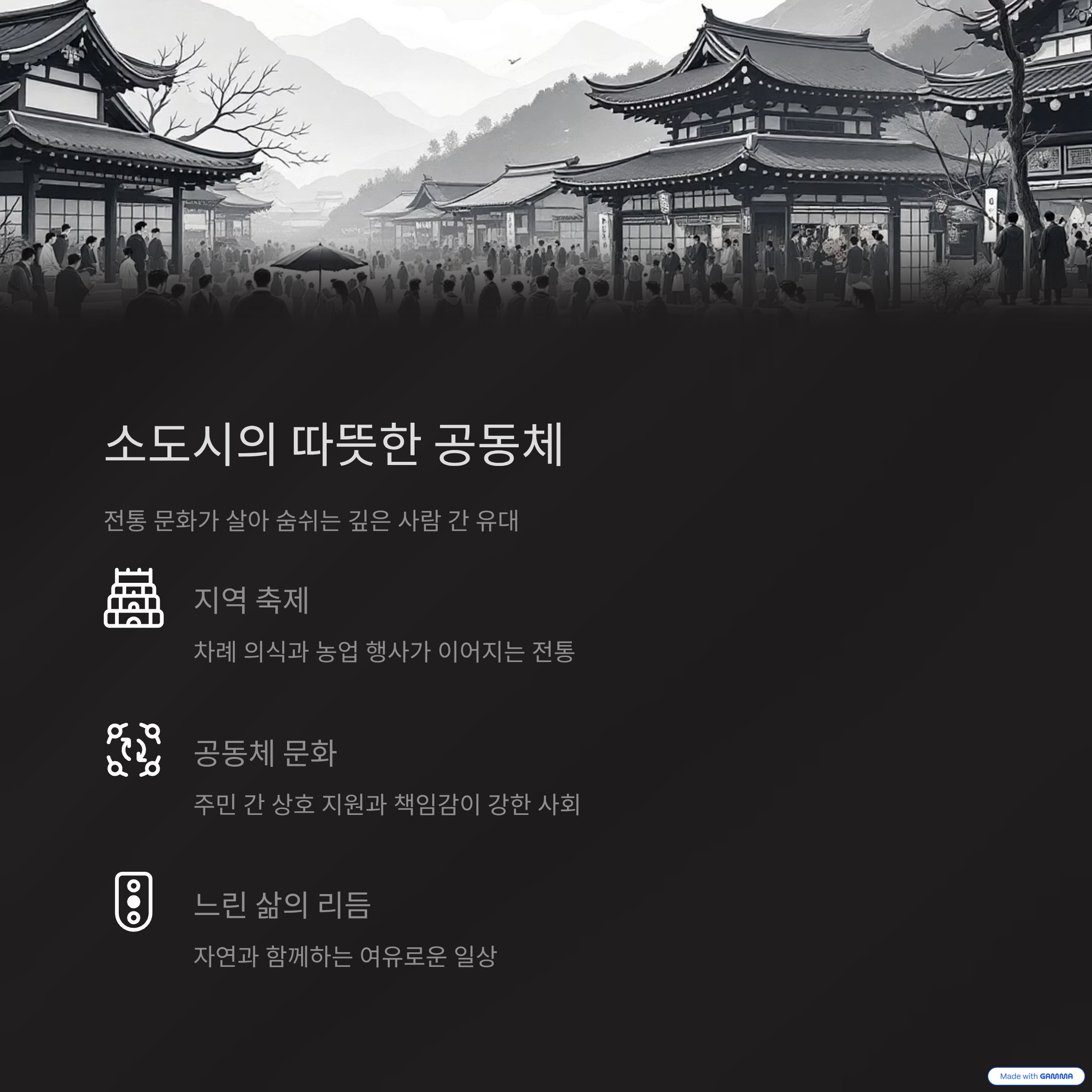 | 소도시 문화 | 공동체 중심의 전통과 따뜻한 인간관계가 돋보입니다. |
