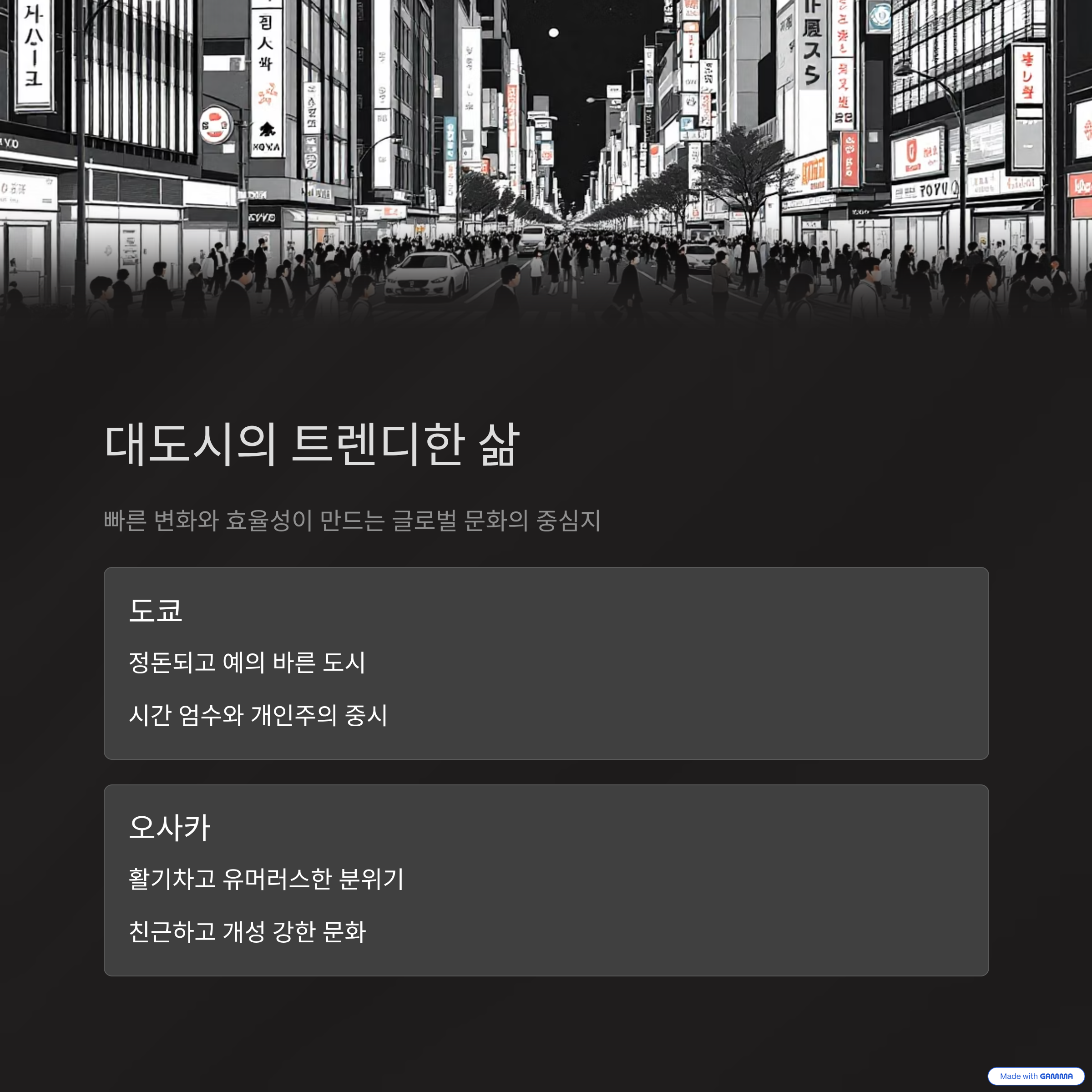 일본의 대도시는 빠른 변화와 높은 경쟁 속에서 살아가는 삶의 방식을 반영합니다. 도쿄, 오사카, 요코하마 등에서는 첨단 기술과 세련된 소비문화가 일상화되어 있으며, 다양한 국적의 사람들이 공존하는 다문화 환경이 형성되어 있습니다. 이로 인해 대도시의 시민들은 개방적이고 효율성을 중시하며, 하루하루를 분주하게 살아가는 모습을 보입니다. 사람들 간의 관계는 다소 형식적일 수 있지만, 그만큼 개인의 사생활을 존중하는 문화가 잘 자리잡고 있습니다.