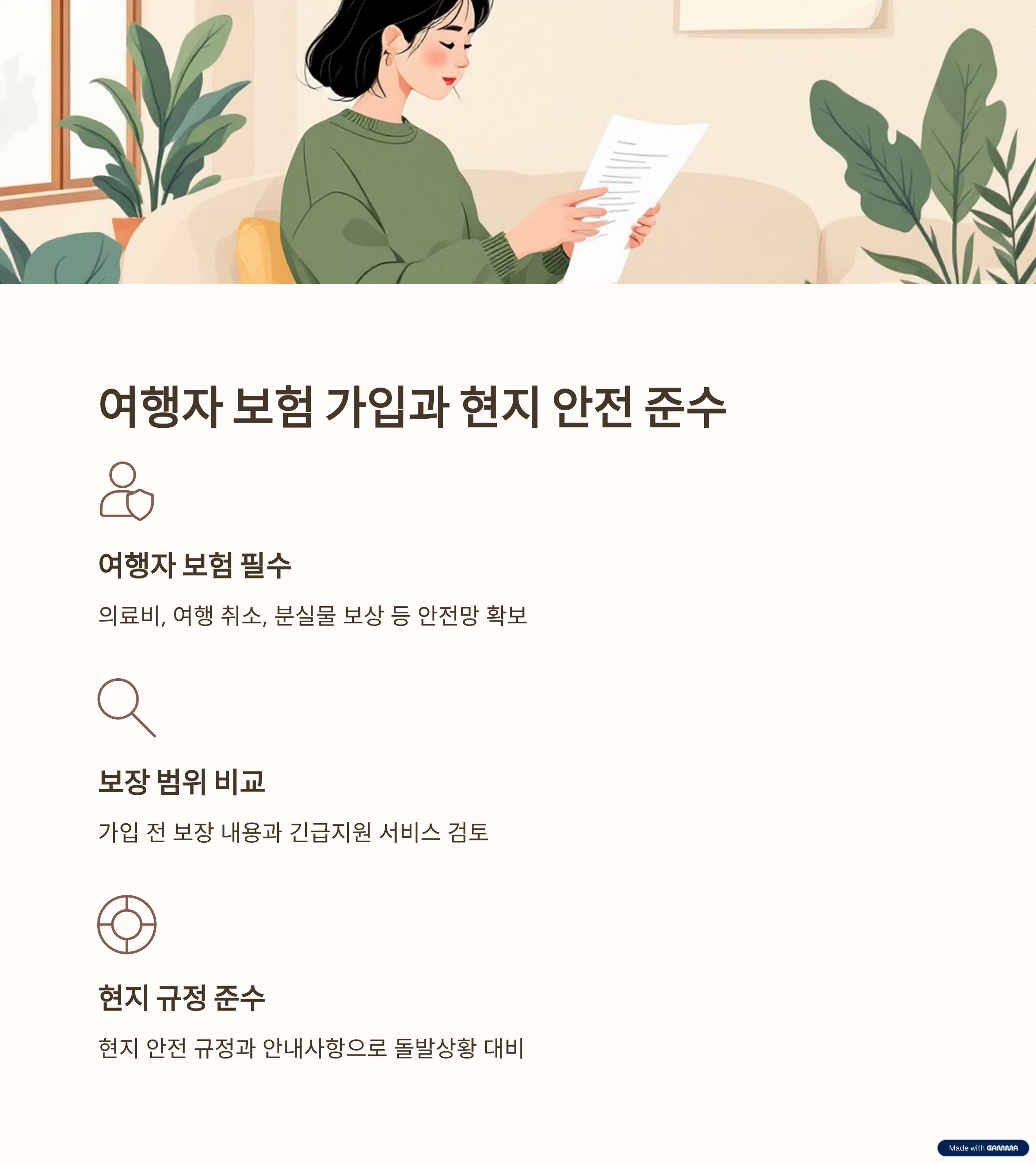 | 숙박, 식사, 입장료 포함 여부 확인 | 보험 적용 범위와 현지 안전 규정 | 개인 준비물과 자유시간 활용 계획 |