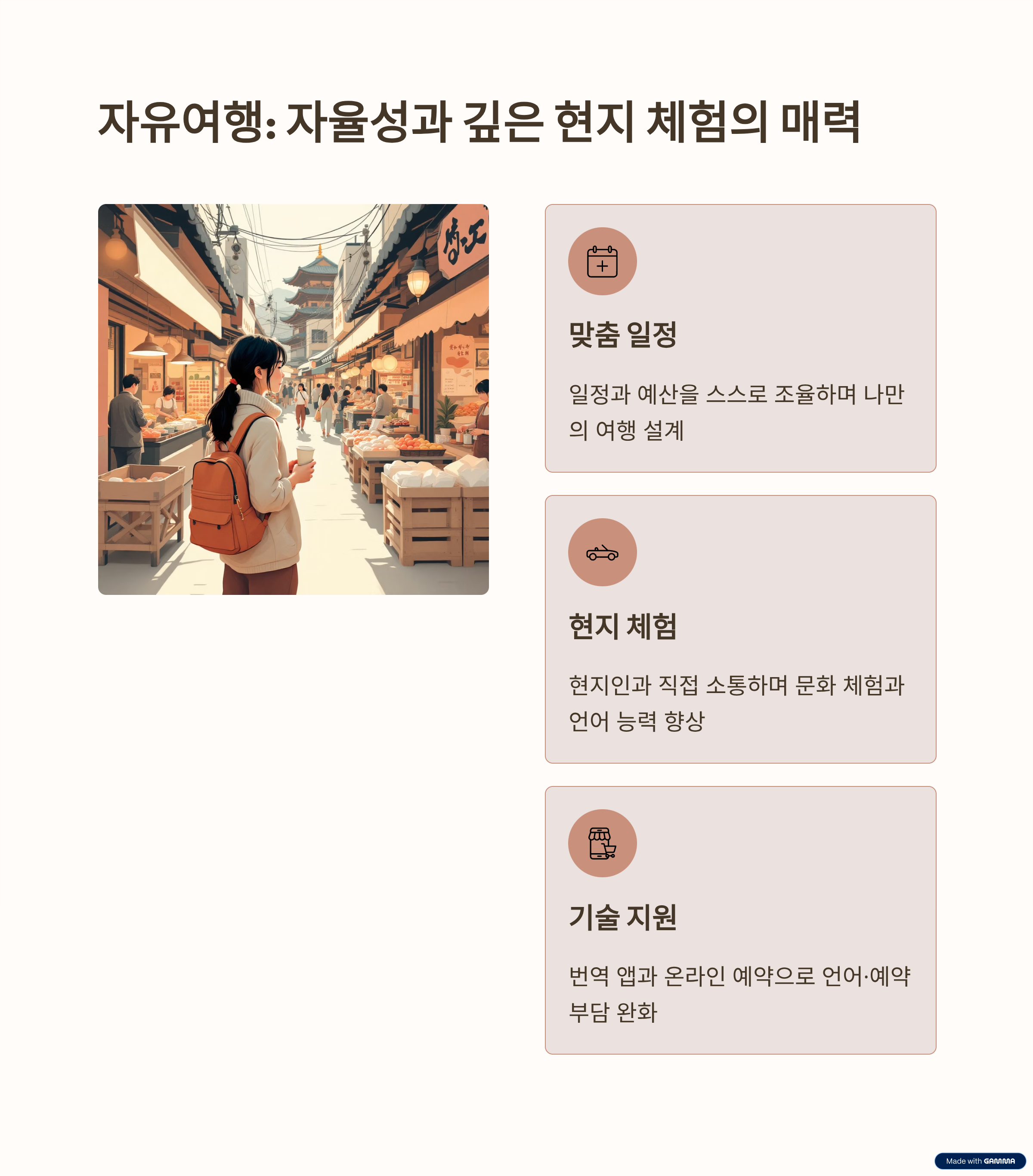 시간 활용 효율 극대화 소규모 여행지 탐방과 독창적 경험 가능 여행 스타일에 맞춘 맞춤형 예산 관리