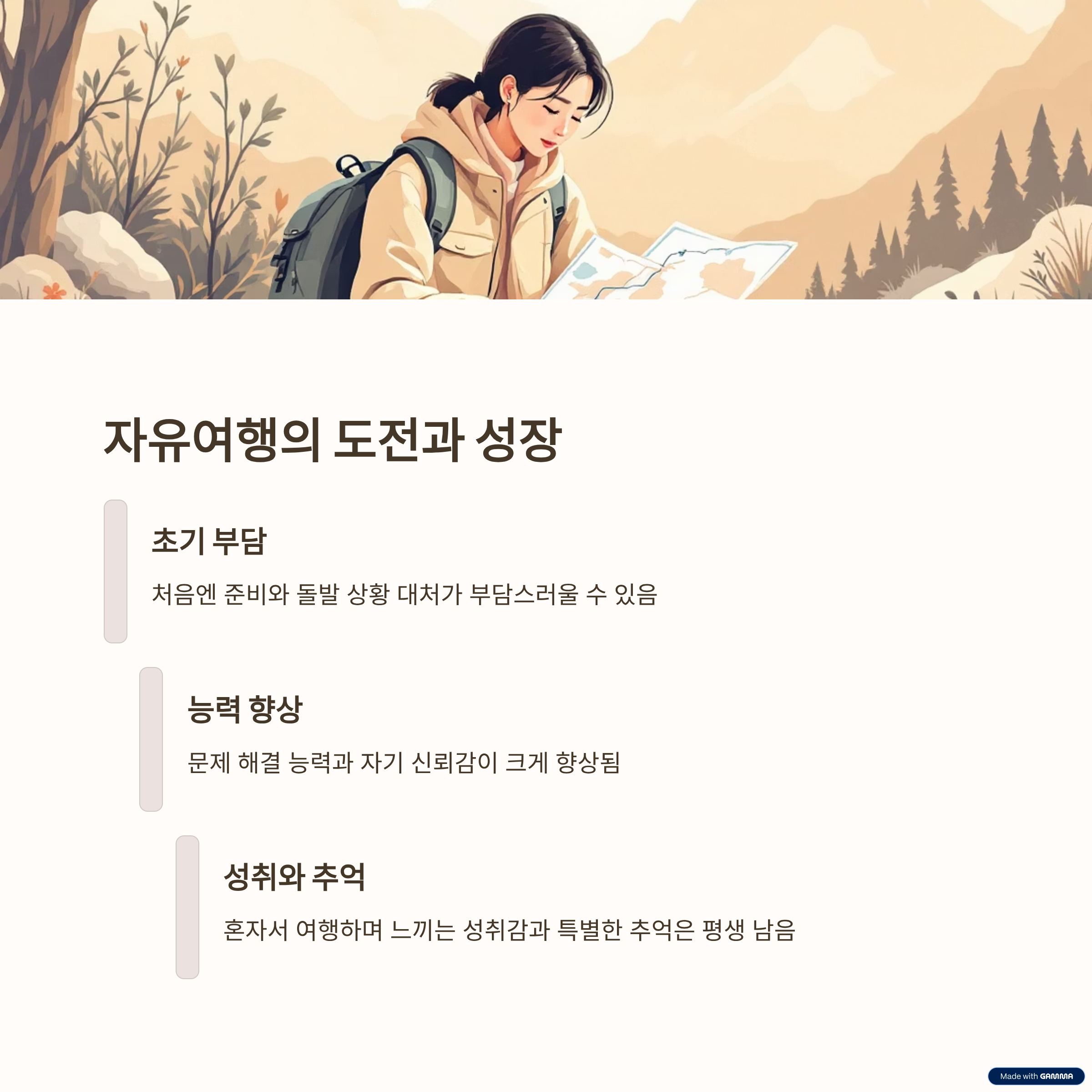 자유여행은 단순히 이동 수단과 숙소를 스스로 예약하는 차원을 넘어섭니다. 이는 자기 주도적인 선택을 통해 진정한 여행의 의미를 찾는 과정입니다. 물론 어려움과 예상치 못한 상황이 따를 수 있습니다. 그러나 그 과정에서 얻는 성취감과 성장 경험은 돈으로 환산하기 어렵습니다. 패키지여행이 제공하는 편안함도 분명 가치가 있지만, 여행에서 얻고자 하는 것이 '자율성'과 '깊은 체험'이라면 자유여행은 분명 더 적합한 선택이 될 수 있습니다. 이 글을 통해 자신에게 맞는 여행 방식을 선택하는 데 도움이 되길 바랍니다.
