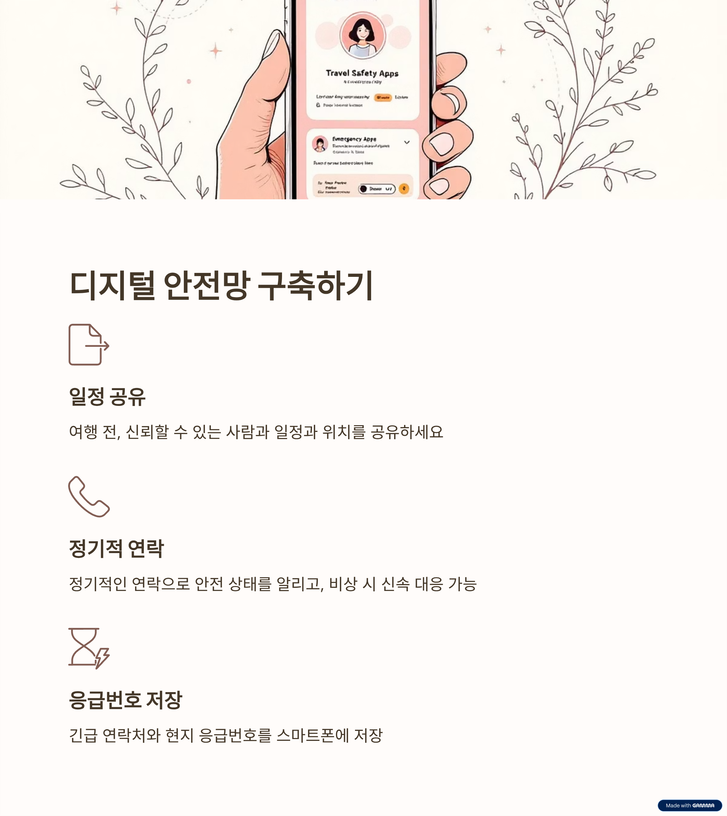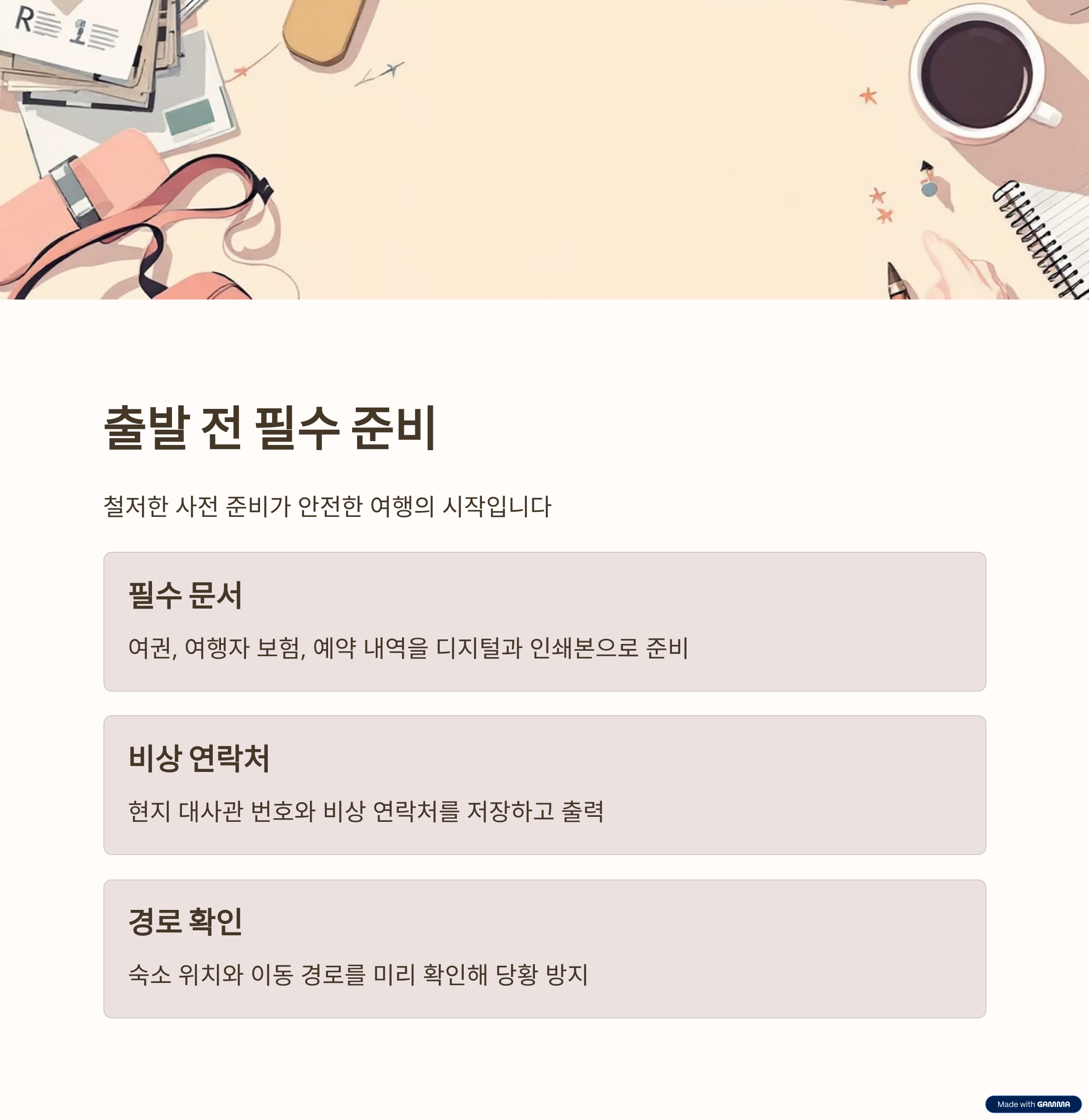 안전 준비 출발 전 서류, 연락처, 숙소 확인 등 필수 점검 사항 요약입니다.