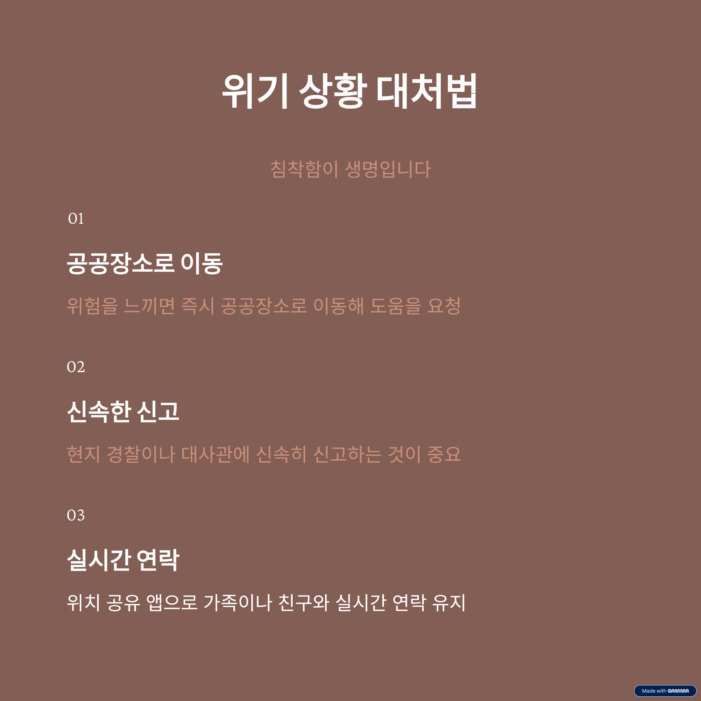 여권, 보험, 예약내역, 비상연락처, 의료정보를 준비합니다. 공인 교통수단 이용, 야간 이동 최소화, 위치공유 활성화 권장합니다. 경찰·대사관 연락, 현지 언어로 간단 표현 준비, 주변 CCTV 확인 권합니다.