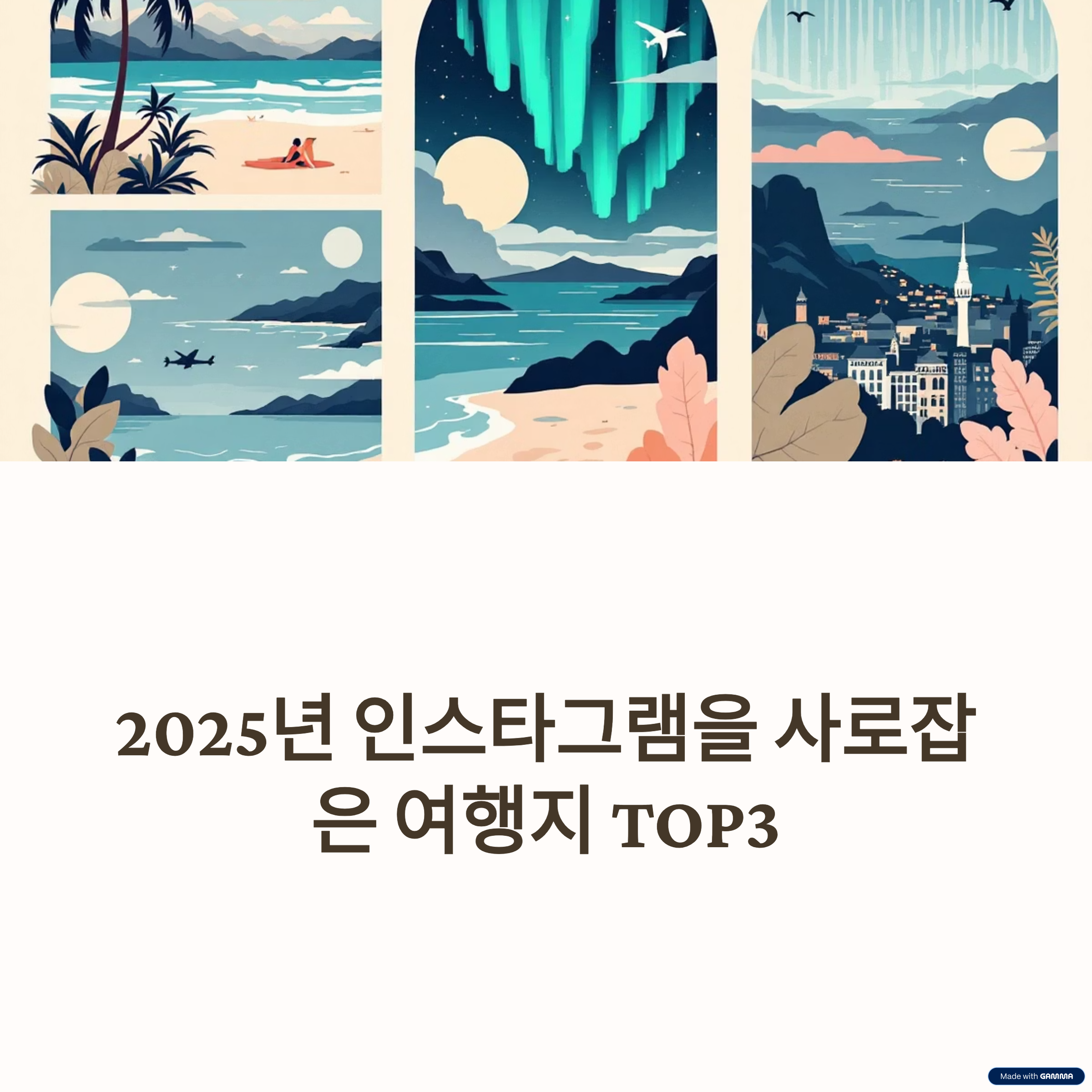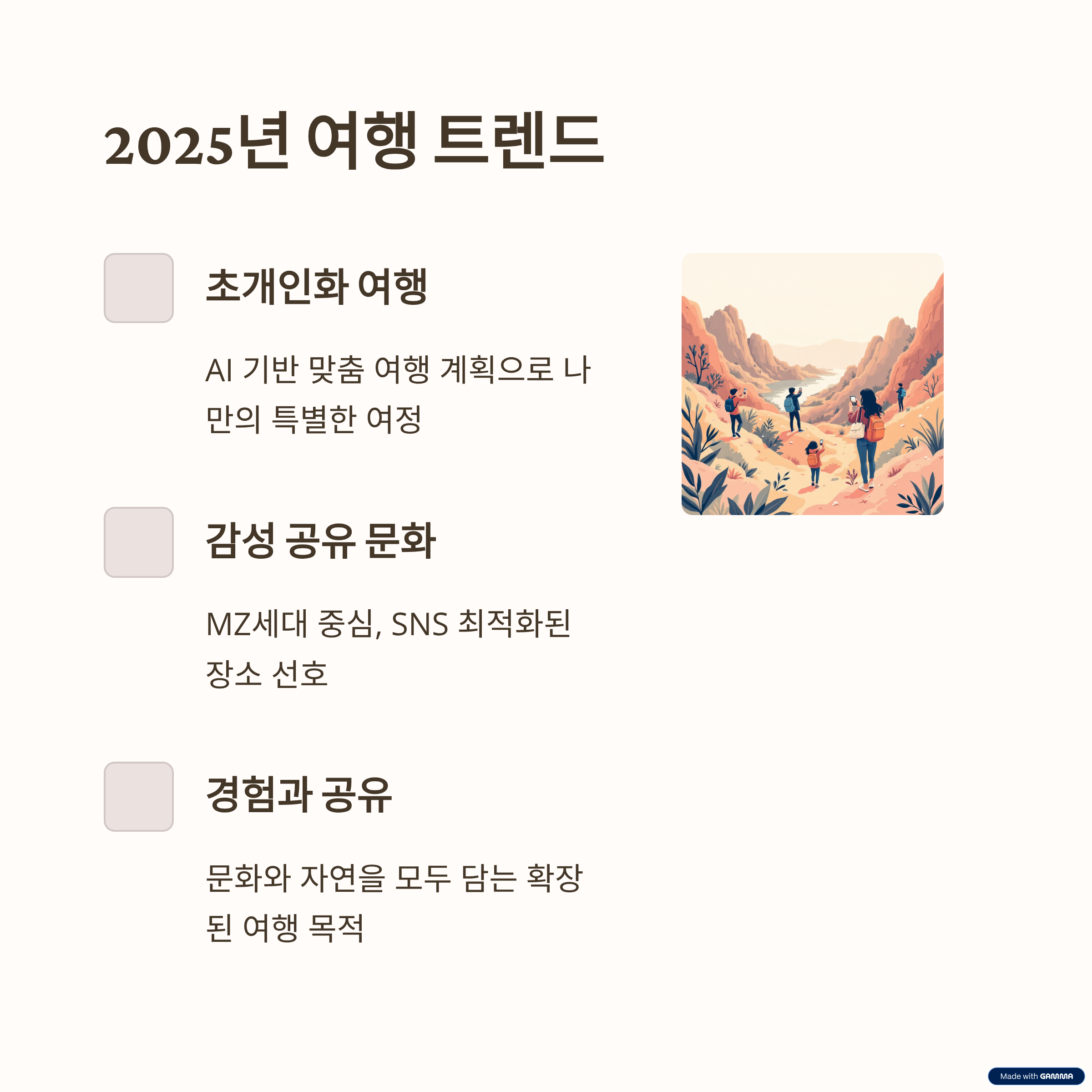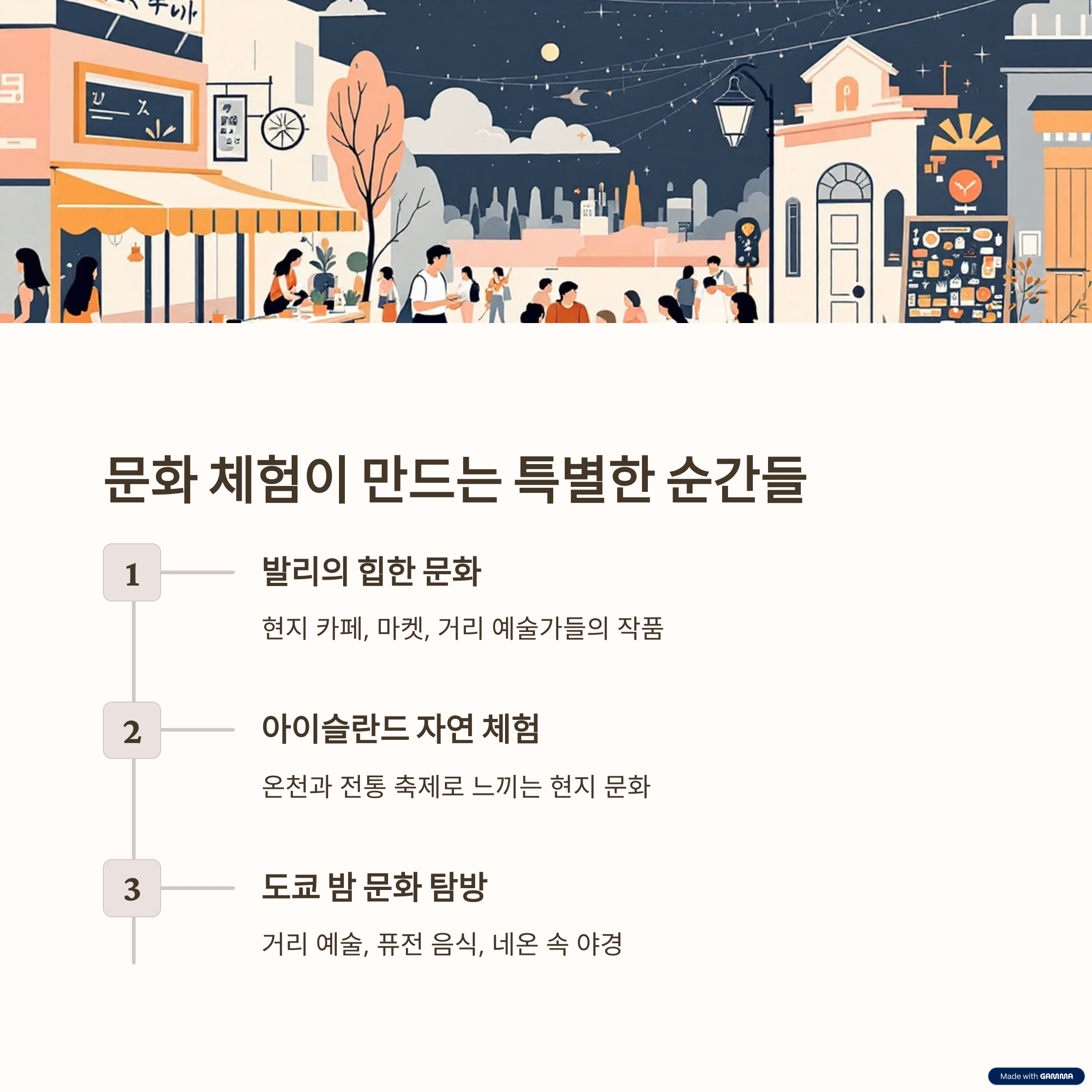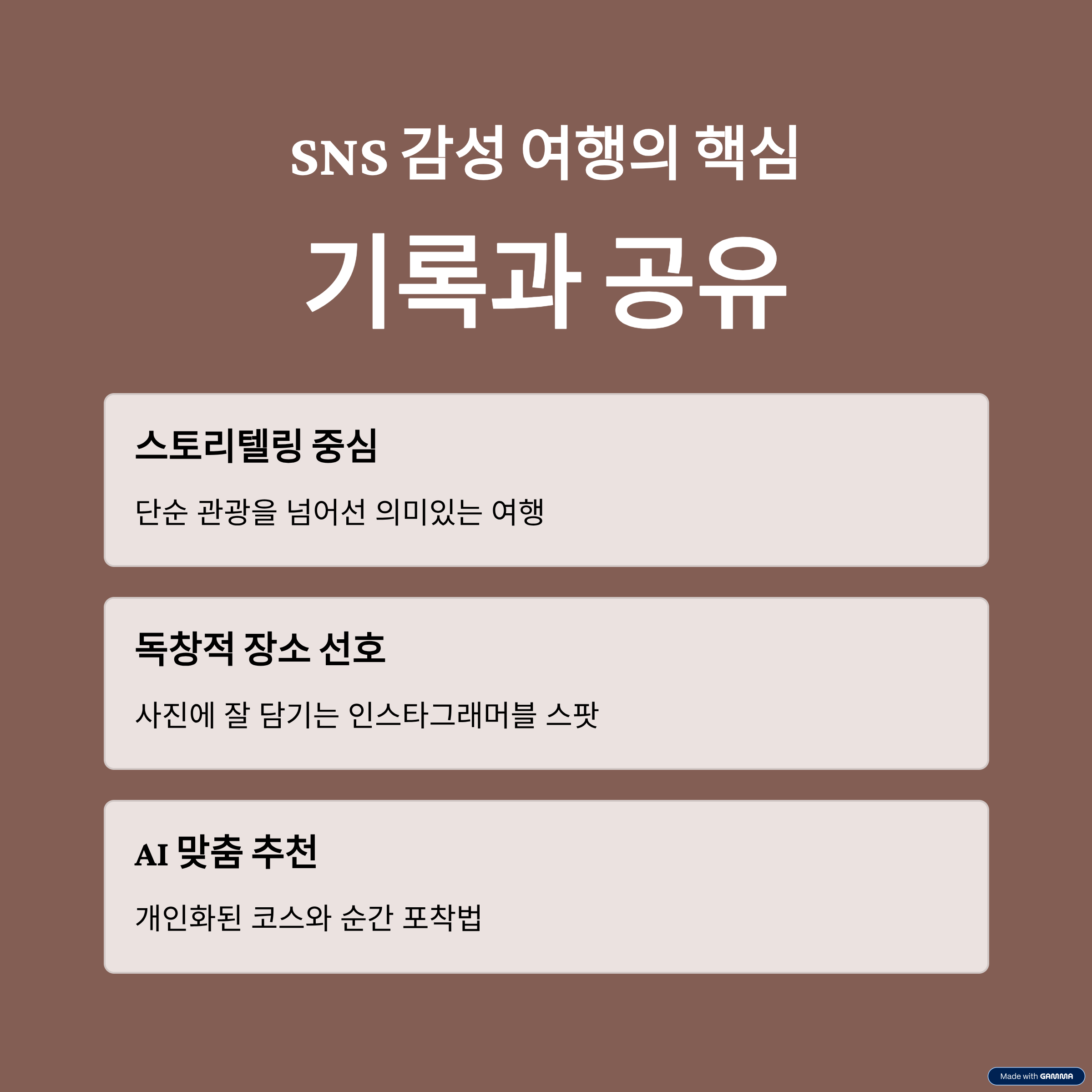| 독창적인 풍경과 체험 요소 | 문화와 라이프스타일 반영 | 기록과 공유 중심의 여행 |
