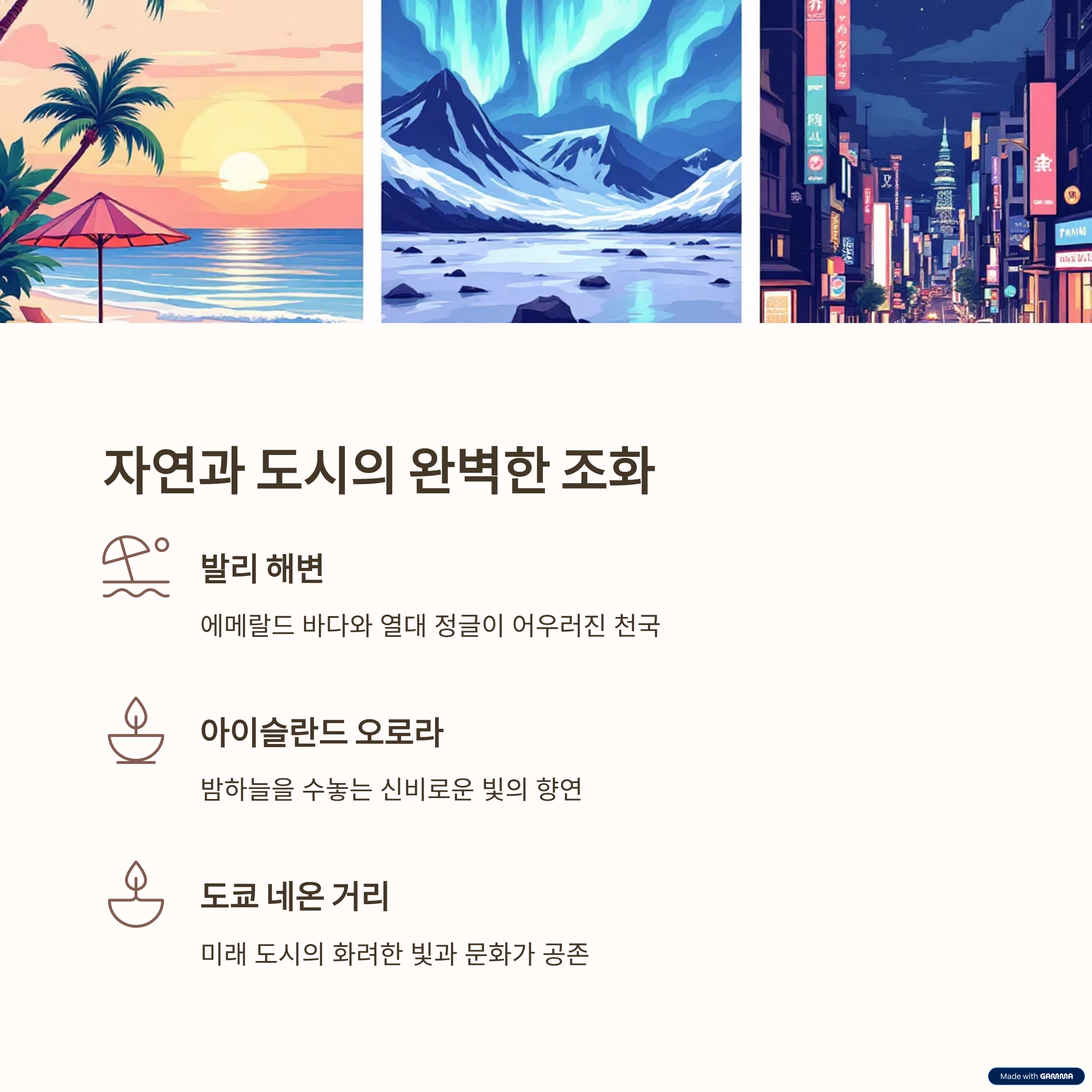 | 해변, 산, 오로라 등 자연경관 | 카페, 마켓, 네온 거리 등 핫플 | 사진과 영상에 잘 담기는 공간 |