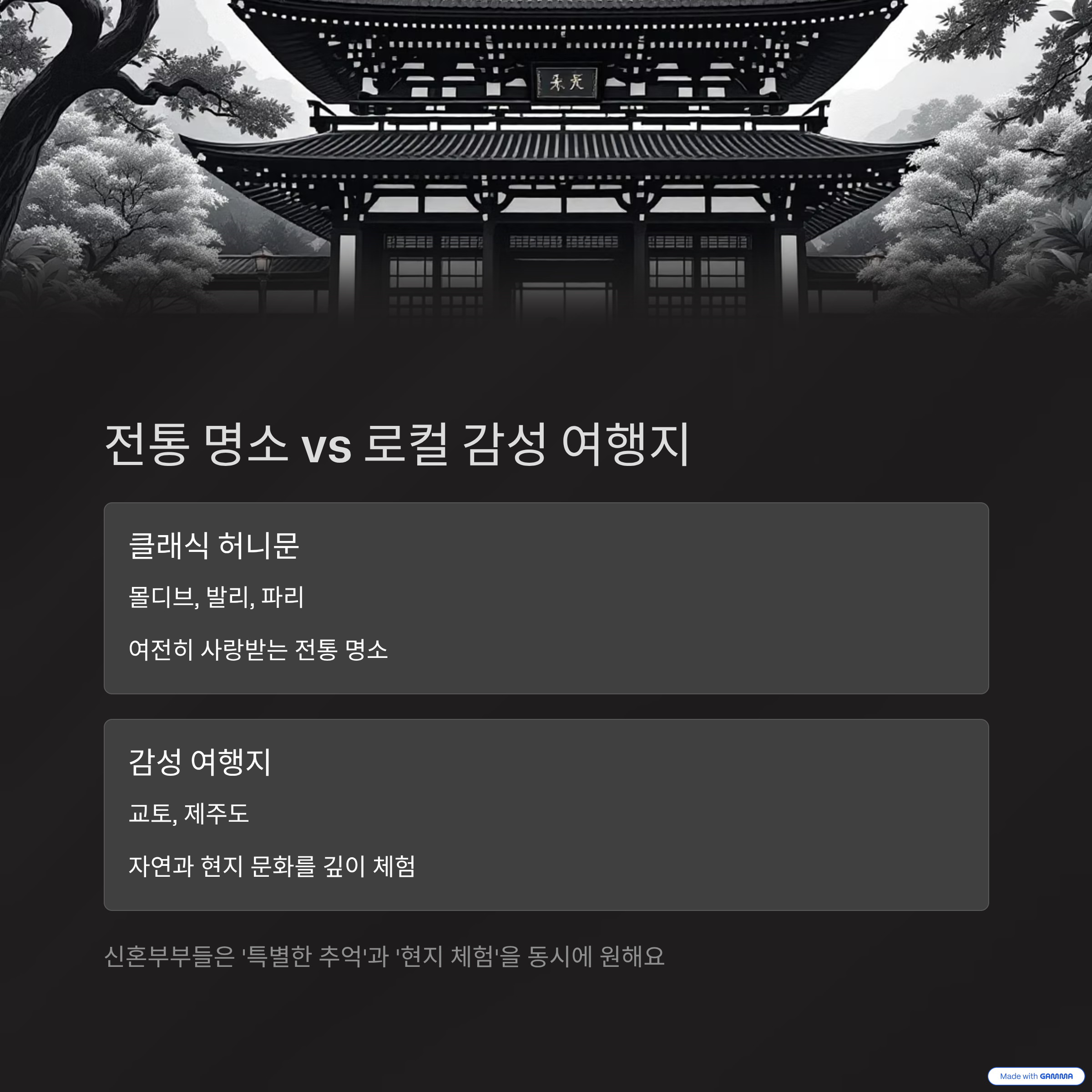 | 몰디브, 발리, 파리, 교토, 제주도 | 지속가능한 여행, 로컬 체험 중심 | 서로에게 집중, 특별한 추억 만들기 |