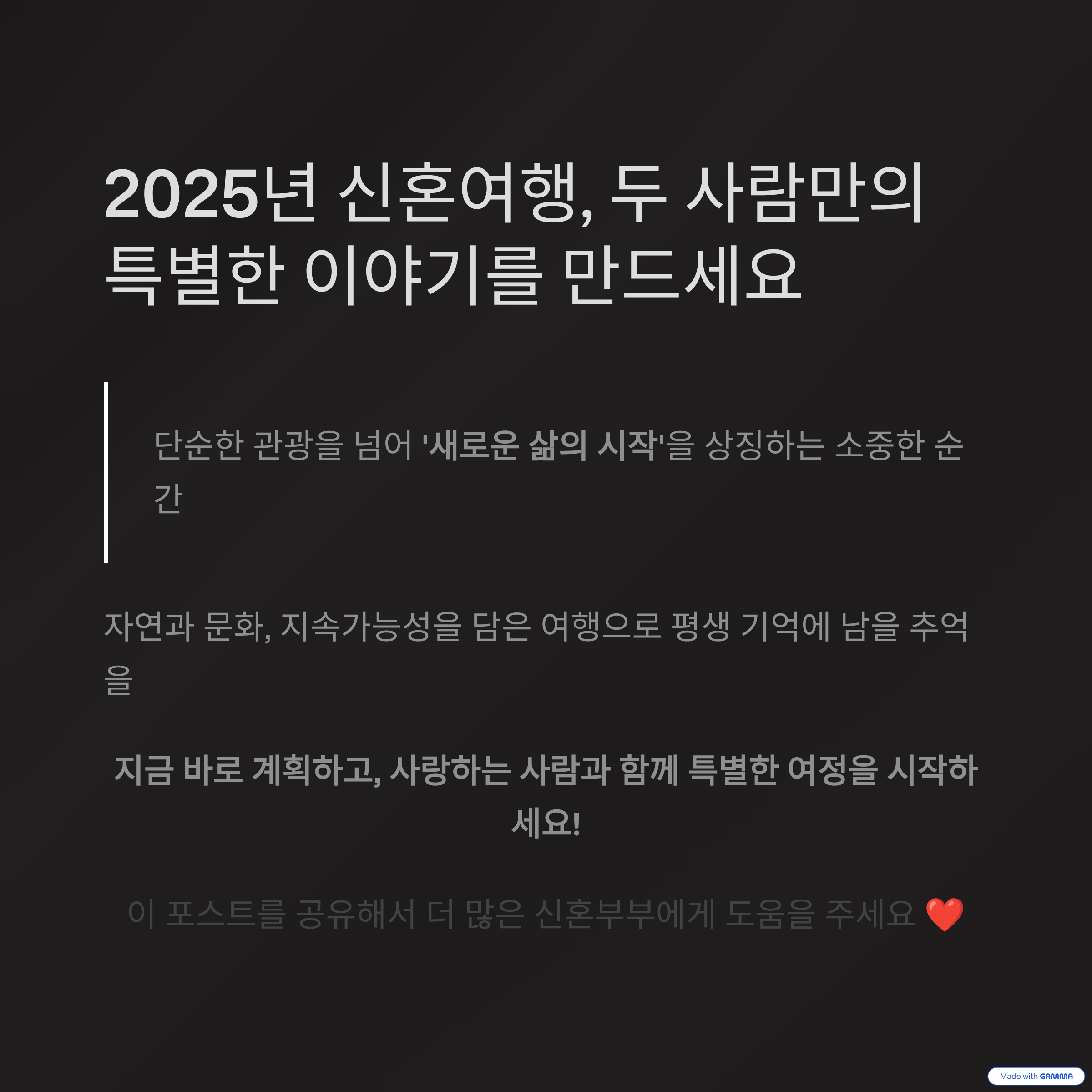 신혼여행은 단순한 휴가가 아니라 부부의 새로운 시작을 함께하는 소중한 경험입니다. 따라서 화려한 여행지 선택보다 서로에게 집중하고 함께 추억을 쌓을 수 있는 공간과 프로그램이 중요합니다. 2025년에는 로맨틱한 풍경과 함께, 환경적 가치와 로컬 경험이 어우러진 여행이 더욱 큰 주목을 받을 것으로 예상됩니다. 이는 신혼부부가 삶의 첫 장을 특별하게 열어가는 데 중요한 밑거름이 될 것입니다.