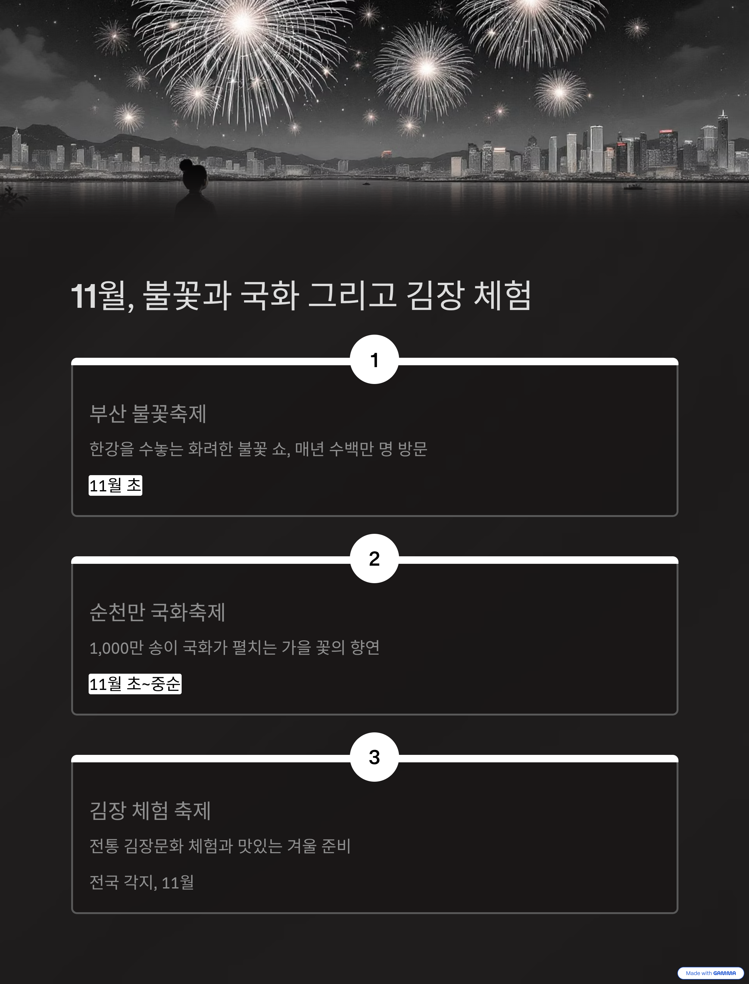 | 가을 문화와 전통 체험 중심 | 늦가을 불꽃과 전통의 향연 | 연말 분위기와 겨울 스포츠 즐기기 |