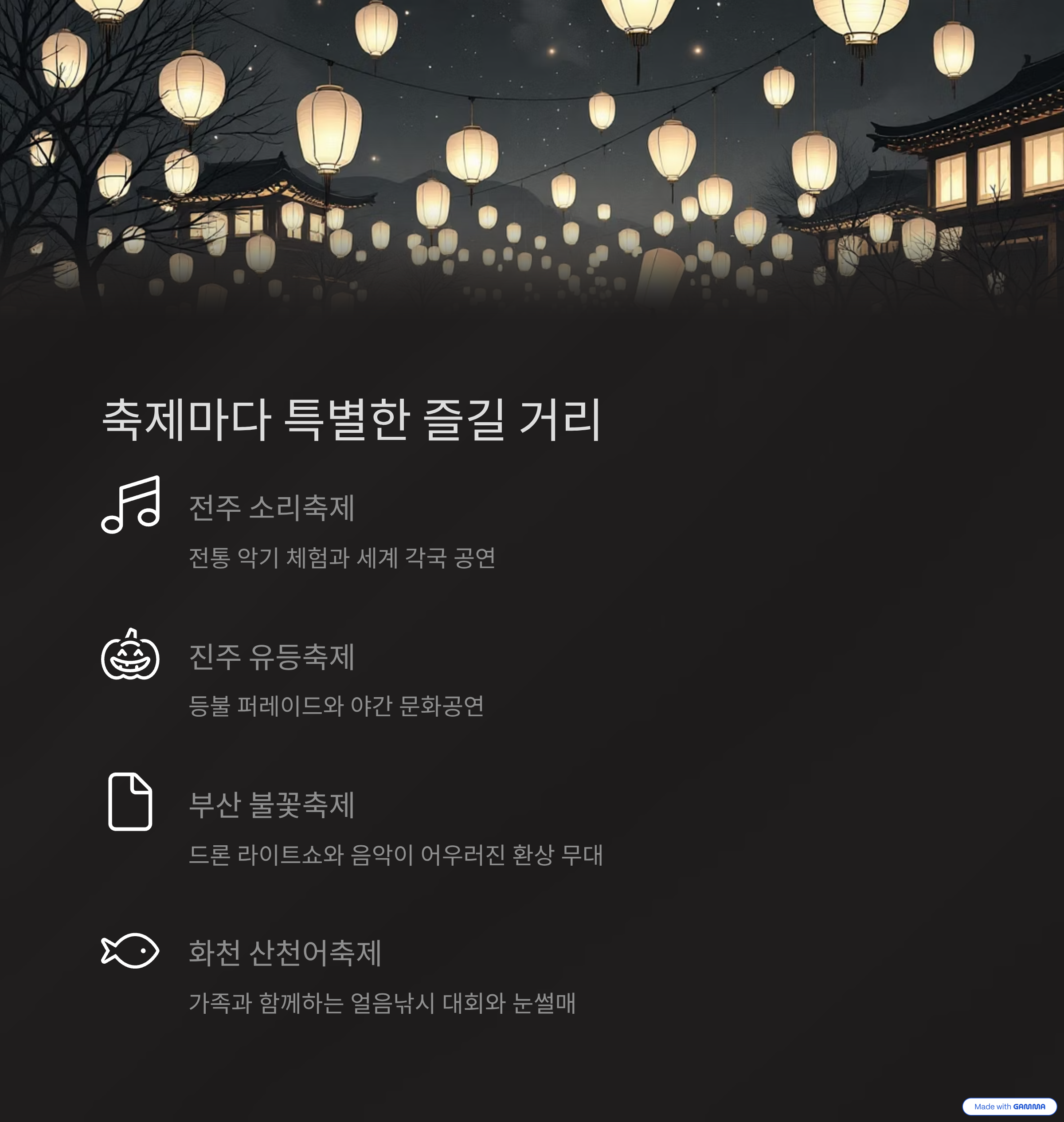 | 전주 소리축제, 안동 탈춤, 진주 유등축제 | 부산 불꽃축제, 순천만 국화축제 | 산천어축제, 크리스마스 마켓, 빛의 축제 |
