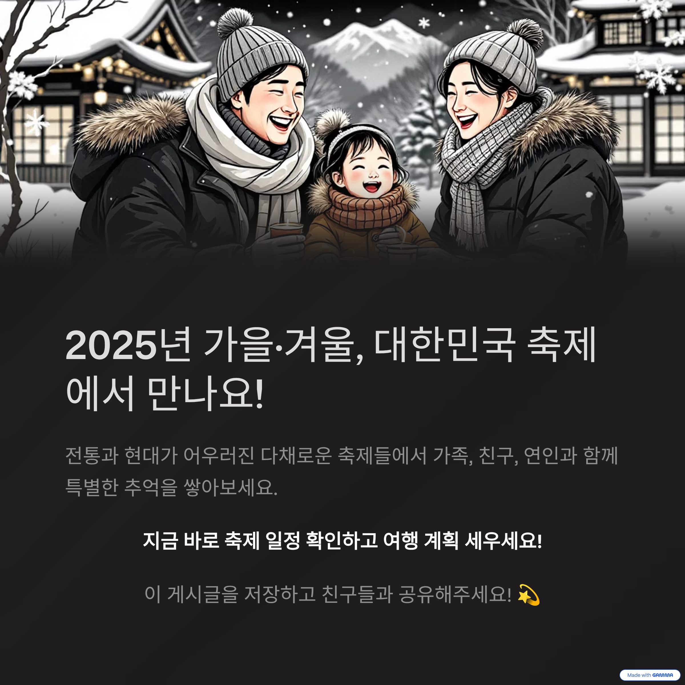 여러분은 가을과 겨울 축제 중 어떤 축제를 가장 기대하시나요? 직접 다녀온 축제 경험이나 추천하고 싶은 행사도 댓글로 나눠주세요. 소중한 경험이 다른 분들에게 유용한 정보가 될 수 있습니다.